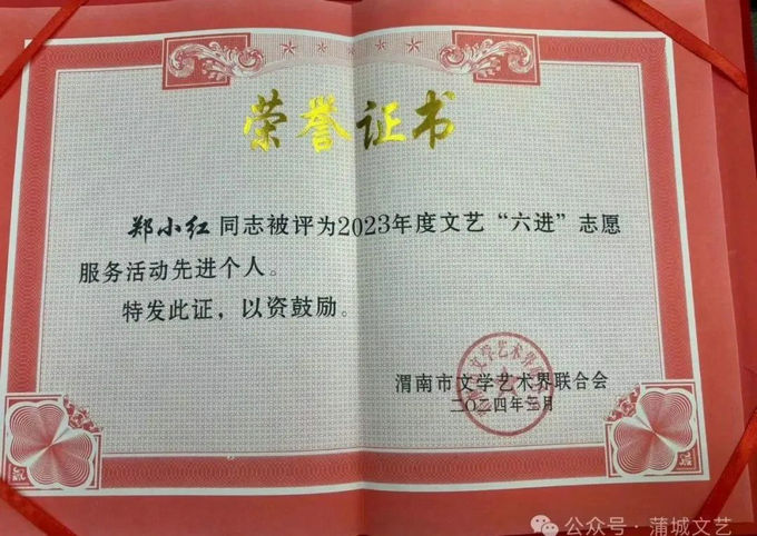 又讯:蒲城县朗诵协会会长郑小红被评为市文联2023年度文艺“六进”志愿活动先进个人。