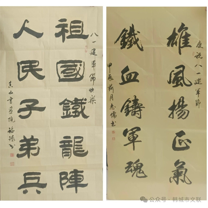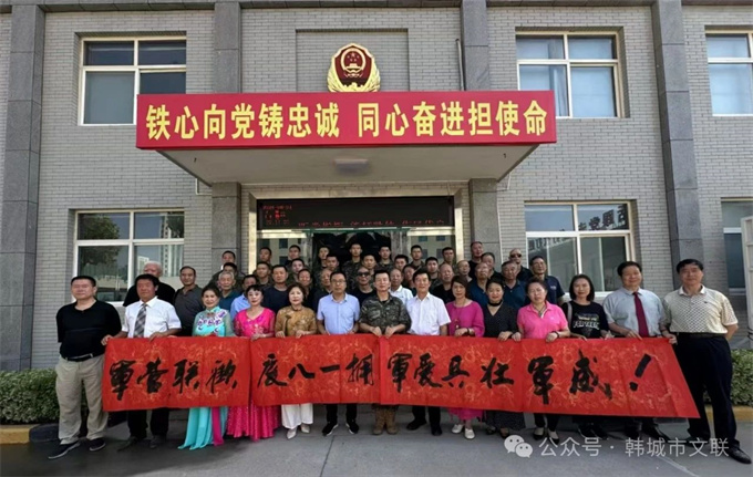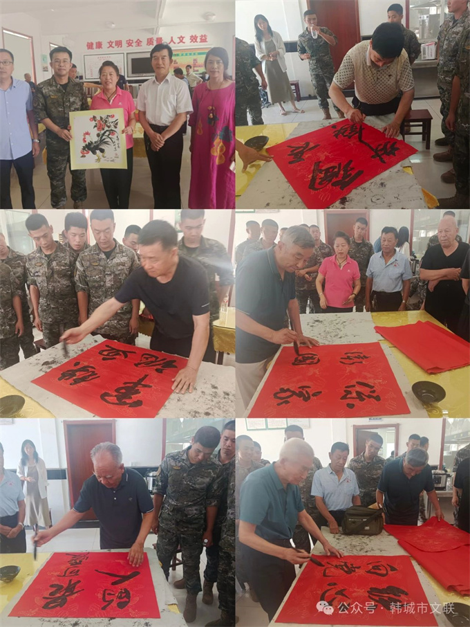 为庆祝建军97周年,进一步增进军民鱼水情谊,推动文艺“六进”志愿服务活动走深走实。8月1日,市文联组织韩城市书画志愿者协会(市香山书画院)联合风追司马艺术团来到武警韩城中队,举办了“军民联欢庆‘八一’ 拥军爱兵壮军威”文艺“六进”文艺志愿服务活动,为部队官兵送去一幅幅精心创作的书画作品,用优美动听的歌声颂扬人民军队的丰功伟绩。