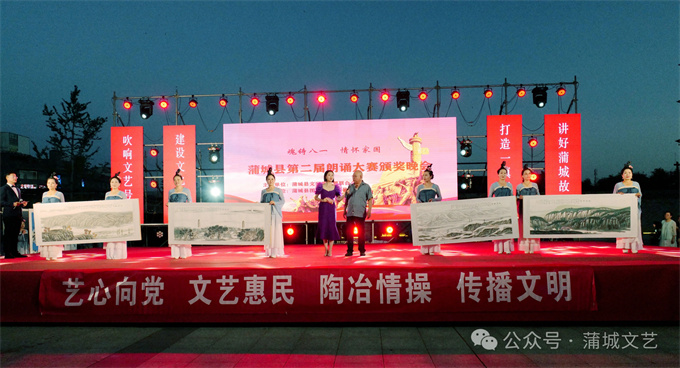 颁奖晚会上演了18个节目,分为“美哉蒲城——家国情怀主题文艺演出”“荣耀绽放——蒲城县第二届朗诵大赛颁奖典礼”“声动山河——蒲城县第二届朗诵大赛优秀节目展”“铁血铸魂——蒲城县文艺界庆“八一”节目汇演”4大篇章,另外,还有序曲“历史永恒——光影报时城摄影展”,尾声“砥砺初心——《回延安》”。在颁奖典礼环节中,大屏幕上滚动播放蒲城书画家作品——《笔墨绘盛世》。