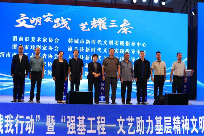 活动现场,合阳县委书记、县新时代文明实践中心主任邓宽社致辞,省委宣传部(省委精神文明建设办公室)、省文联,渭南市委宣传部(市委精神文明建设办公室)为韩城市、合阳县、富平县三个志愿服务队代表授旗;省戏剧家协会、省民间文艺家协会,市美术家协会、市戏剧家协会、市文艺志愿者协会、市书法家协会、市曲艺家协会等单位与渭南14个县(区)的新时代文明实践中心(所、站)进行了“强基工程”——文艺助力基层精神文明建设行动结对签约;文艺志愿者代表宣读“文明实践·艺耀三秦”文艺志愿者助力文明实践倡议书。