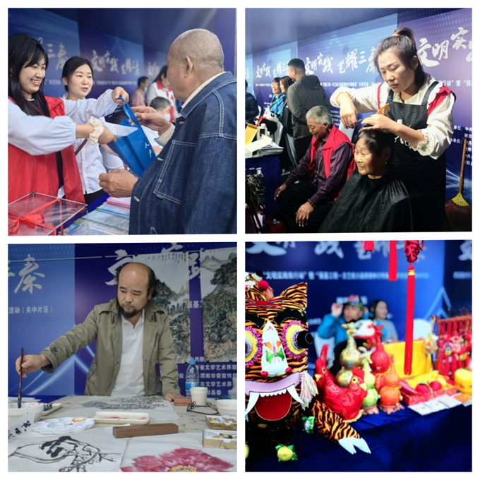 当天,活动现场还开展了文明实践集市服务活动,围绕政策宣传、非遗文化、农特产品展示、爱心义诊、书法作品、心理健康、便民服务等内容设置了21个服务摊位,吸引了众多群众前来“赶集”,现场热闹非凡。草编、皮影、石刻等非遗文化展区让群众在欣赏文化、亲身体验中零距离感受到了非遗文化的魅力。心理卫生健康协会通过心愿便利贴、涂色体验等丰富的小活动吸引了许多群众关注,受到了群众一致好评。健康义诊、书法绘画、义务剪发等活动为广大居民送上了一体化、多样化、创新型的文明实践组合“套餐”服务,提升了群众的幸福感和获得感。