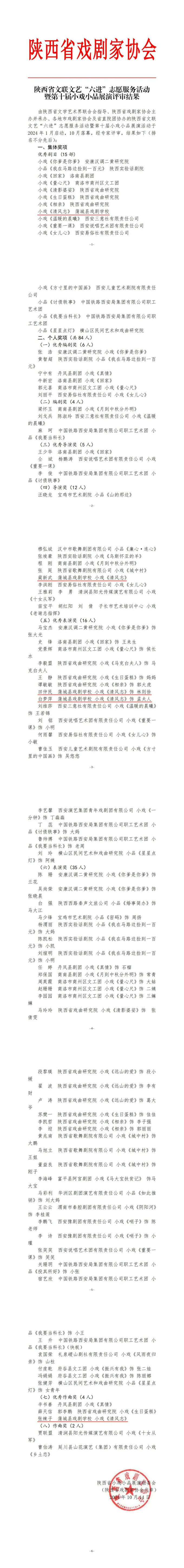 由陕西省文学艺术届联合会指导,陕西省戏剧家协会主办并承办、各地市戏剧家协会及省直院团协办的陕西省文联文艺“六进”志愿服务活动暨第十届小戏小品展演活动于2024年10月落下帷幕。经专家评审,蒲城县戏剧学校创排选送的小戏《清风志》荣获“优秀剧目”集体奖项;该剧目导演蔺新武荣获“导演奖”,作曲张辣子荣获“优秀作曲奖”,演员田仲民和白梦萍荣获“优秀表演奖”。
