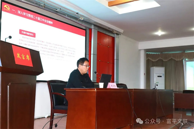 会议特别邀请到原富平县委党校副校长、一级主任科员赵茂明作了“党的二十届三中全会精神”宣讲。分别从“深入学习贯彻二十届三中全会精神”、“深化文化体制机制改革”、“推动文联事业高质量发展”三个方面,阐述了坚定文化自信、当代文化发展特点与趋势、锚定建成文化强国目标,不断发展新时代中国特色社会主义文化等内容,进一步说明“以文化人,更能凝结心灵;以艺通心,更易沟通世界”。