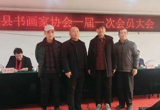蒲城县书画家协会主席团:主席刘寿杰(右二) 副主席杨福荣(兼秘书长) 廉水社(右三) 宣传部长姜宽亮(右一)