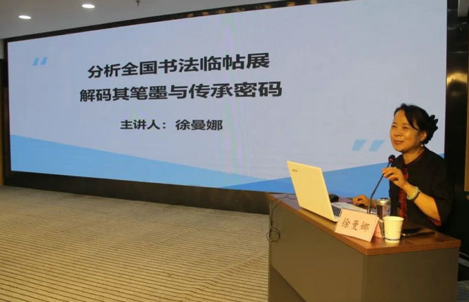徐曼娜以《分析全国书法临帖展 解码其笔墨与传承密码》为题,结合她深厚的学养和独到的艺术视角,围绕临摹步骤、选帖丰富性及临帖作品分析三大核心版块,展开深入剖析,尤其是对经典碑帖的解读,既有理论高度,又有实践指导意义。讲解中,她时而引经据典,阐述临帖理论的精妙之处;时而结合全国书法临帖展的优秀作品,细致拆解笔法结构,语言深入浅出、通俗易懂。尤其是对经典碑帖的解读,既有高屋建瓴的理论高度,又蕴含实用的实践指导价值,让在场书法爱好者对临帖有了全新的认识和感悟。