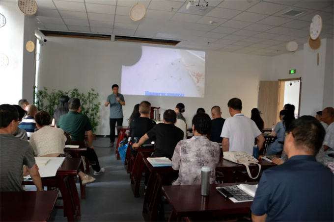 就书法投稿问题,闵老师进行了认真分析,“投稿不是盲目创作,要按照评审规则,弄清‘审美倾向’。”他从形式、内容、细节三方面详细讲解。形式上,篆书宜用屏条显古朴,小行草可借手卷增气韵;内容上,需规避文字差错,多选经典诗词贴合赛事主题;细节上,评委更看重“笔法纯度”“墨色层次”“节奏变化”。通俗的讲解,让在场爱好者豁然开朗,受益匪浅。