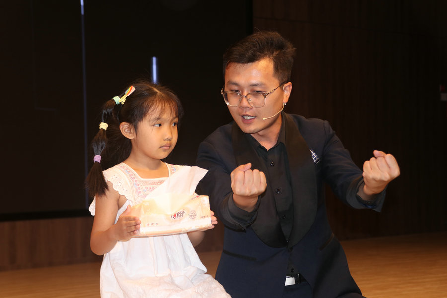演出中,“华山戏法”第五代传承人贾博涛、雷霖带来“华山戏法”经典节目《鸳鸯棒》,他们默契配合,完美演绎出“华山戏法”的独特魅力。来自西安交通大学的“华山戏法”青年演员带来的精彩节目《选择》《跳动的绳结》《幸福》等,幽默的语言、精妙的手法令现场观众啧啧称奇。表演过程中,表演者还不时邀请家长和小朋友们上台互动,手把手教他们体验“魔术”的乐趣,台上台下笑声不断,气氛热烈。