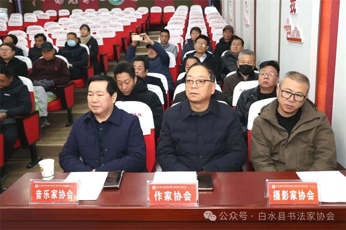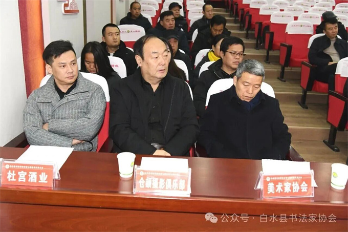 参加会议的领导及嘉宾有:渭南市书法家协会主席薛小虎、渭南市书法家协会副主席兼秘书长陈龙、中共白水县委宣传部文联主席刘小军、白水县社会组织党群服务中心支部书记杨亚亚、白水县文化和旅游局干部吴斌、白水县书法家协会名誉主席刘培民、白水县书法家协会名誉主席杨陌,白水县书法家协会主席许文阁、白水县作家协会党支部书记赵鹏、白水县美术家协会主席孙秀西、白水县音乐家协会副主席许永康、白水县摄影家协会主席高新峰、白水县仓颉摄影俱乐部主席史洋军、白水杜宫酒业总经理王晨,以及会员代表六十余人参加了本次大会。