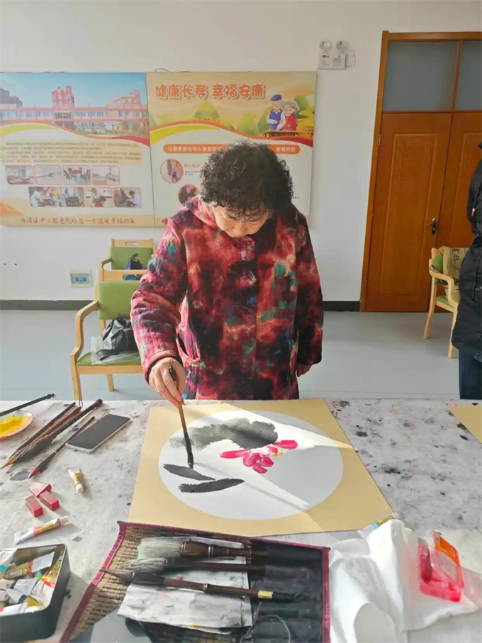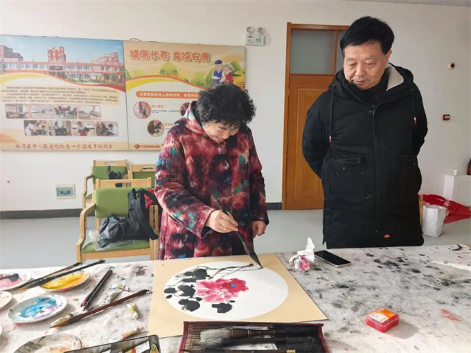 尤为引人注目的是魏战民老师和董玲玲老师的国画创作。他们以娴熟的技法、温润的色彩,现场绘就了一幅《福禄寿禧图》。画中,雍容华贵的牡丹象征富贵吉祥,藤蔓绵长的葫芦谐音“福禄”,寿桃饱满圆润寓意健康长寿。三者巧妙结合,构图精美,意蕴深厚,寄托了对老人们生活幸福、福寿双全的美好祈愿,引得在场老人连连称赞。