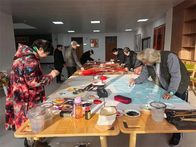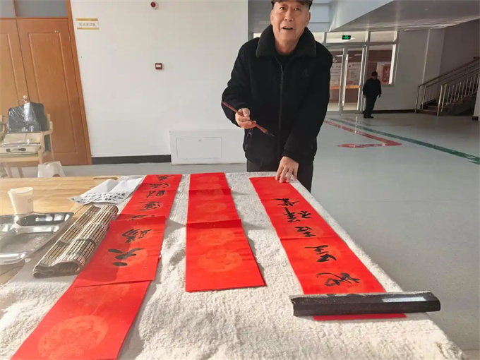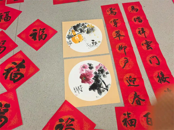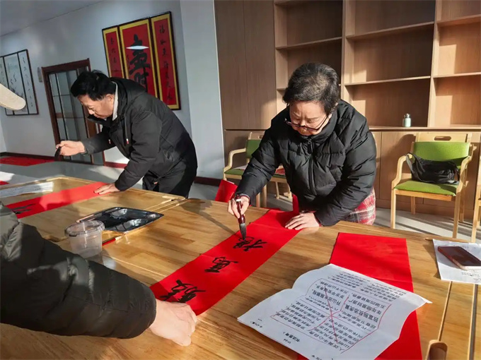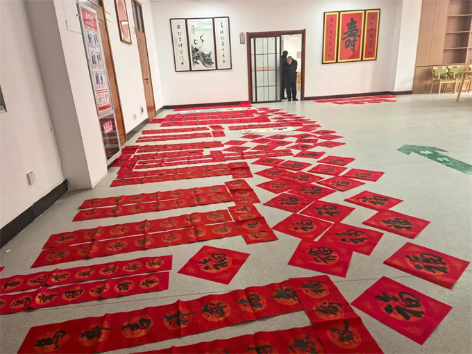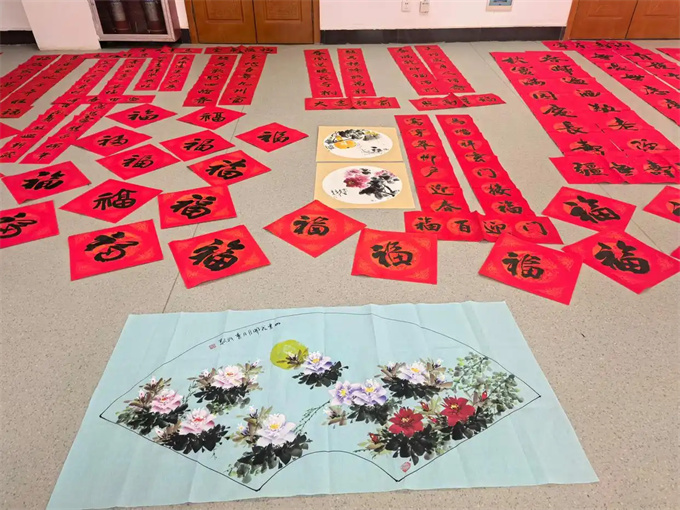 “这画真好看,牡丹和寿桃,看着就喜庆!”一位捧着董玲玲老师画作的老人高兴地说。另一位老人则对魏战民老师的月季兰花图爱不释手:“挂在房间里,每天看着心情都好。”敬老院的活动室内欢声笑语,春联、福字和画作铺满大厅,红色的喜庆与墨香的雅致交织在一起,构成了一幅温馨动人的画面。