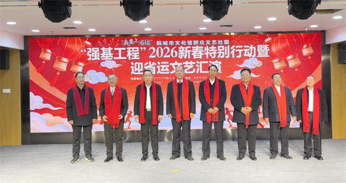为深入学习贯彻市委书记王浩在“送温暖、办实事”活动中“办好顺民意惠民生暖民心实事”的重要指示精神,扎实推进“强基工程”文艺助力基层精神文明建设,营造喜迎省运的浓厚社会氛围,1月20日,由韩城市文学艺术界联合会、渭南市民间文艺家协会等共同举办、韩城市桢州金色艺术团联合承办的“强基工程”2026新春特别行动暨迎省运文艺汇演在韩城市文化馆成功举办。整场活动以文艺为桥,将党的温暖与新春祝福送到群众心坎上,以昂扬向上的精神风貌迎接省运盛会。