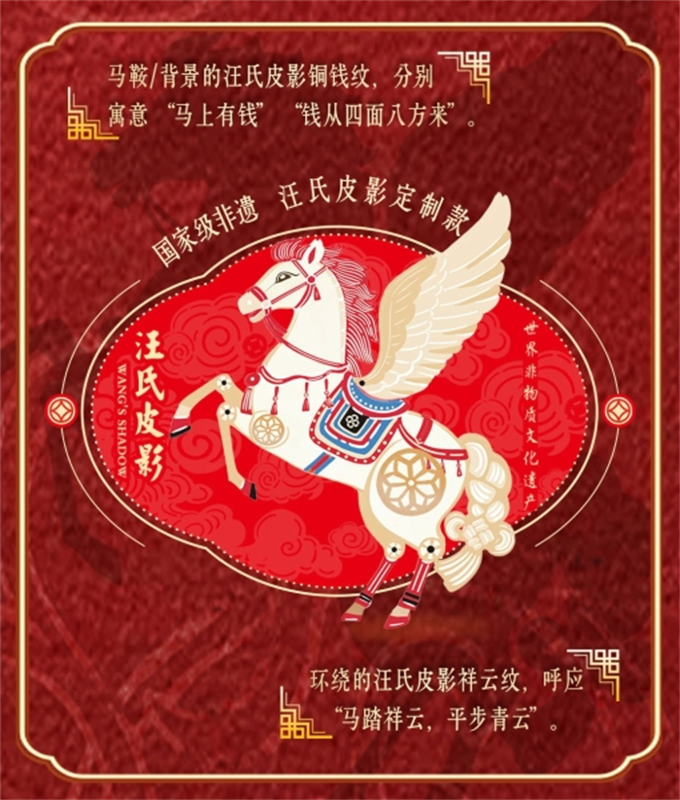 今年1月至2月,汪氏皮影与知名饮品大窑携手,推出了极具巧思的马年限定非遗联名罐。此次合作并非简单的包装印制,而是将皮影艺术的语言重构。罐身上,一匹象征丙午年的骏马蹄踏祥云,马鞍饰以铜钱纹,寓意“马上发财”;马尾以中国结收束,头部和尾部则采用了汪氏皮影经典的拉丝纹与八瓣梅纹。最精妙之处在于,设计保留了皮影操纵杆的图样,暗喻“美好祝福尽在掌握” 。这将原本只能在博物馆或剧场看到的皮影戏,化作了年夜饭餐桌上可触可感的年味,实现了非遗与快消品在情感价值上的深度融合。