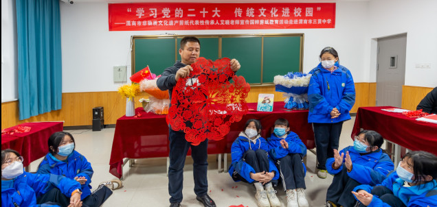 活动现场,渭南市非物质文化遗产传承人艾晓老师为三贤中学学生社团讲授剪纸艺术,倾情传艺,充分体现了文艺志愿者下基层、进校园,传播文明、弘扬经典的高尚艺德和优良作风。