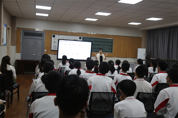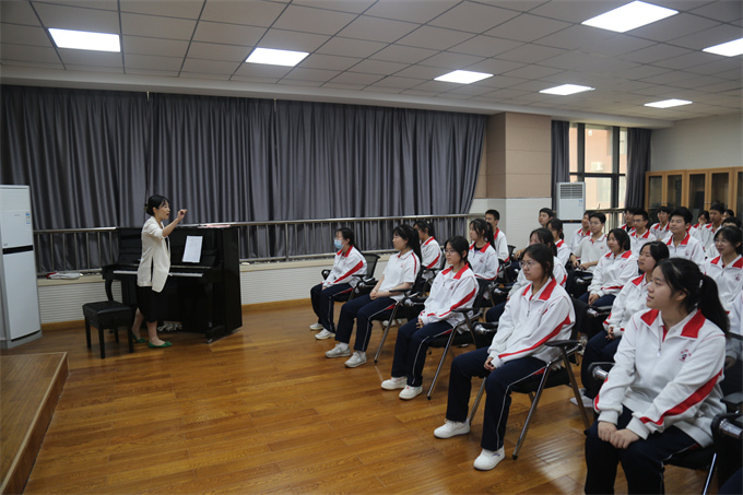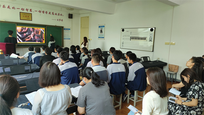 在尚德中学,李江苗老师执教了人音版《音乐鉴赏》第三十二节《色彩斑斓的印象派——德彪西》,李老师通过现场作画激发了学生的学习兴趣,并从音乐要素对作品的四个部分层层进行分析,让学生感受“大海的安详与宁静——大海的色彩斑斓——大海的变幻无常——大海的辉煌灿烂”,将学生带入了印象主义音乐殿堂。