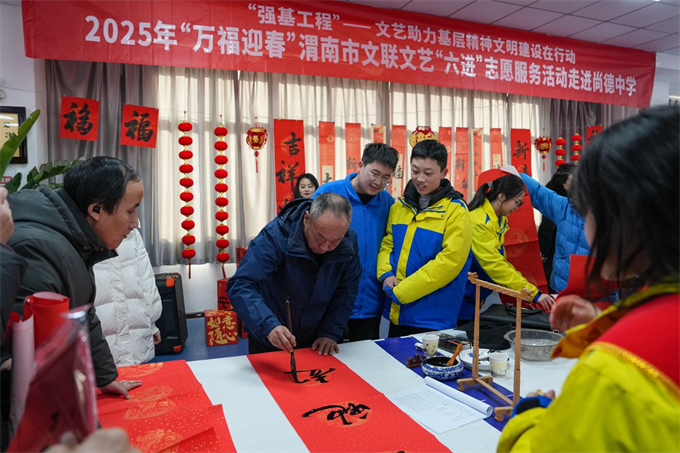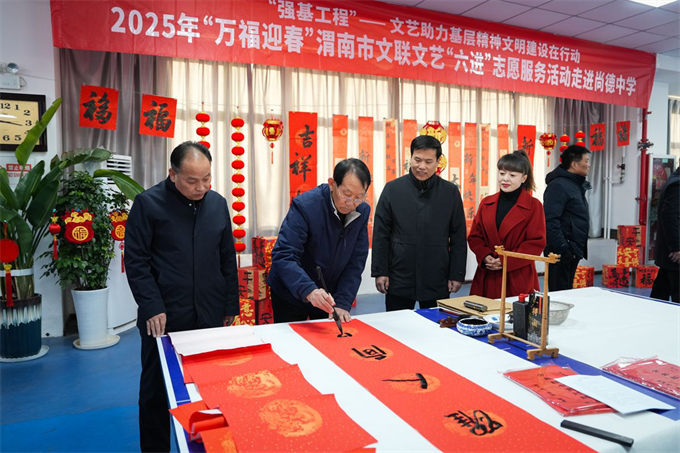 此次“万福迎春”文艺“六进”走进尚德中学活动,是渭南市文学艺术界联合会和渭南市文艺志愿者协会弘扬传统文化、服务基层的重要举措,通过义写春联的形式,将文艺工作者的深情厚意和对新年的美好期盼送到了师生们身边,为校园注入了满满的正能量。