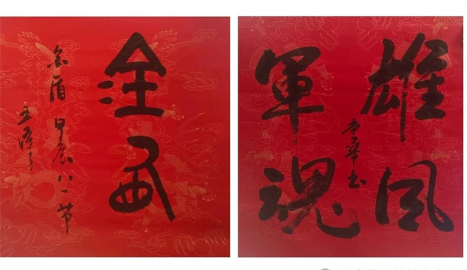 书画家们挥毫泼墨,现场书写了“铁血军魂”“祖国铁龙阵,人民子弟兵”“最可爱的人”等书法作品,并送上“雄鸡牡丹”图。创作作品既有对军旅生活的写照,也有对军人崇高精神的赞美。书画文艺志愿者们用书画艺术丰富军营生活,赓续红色血脉,凝聚军民情谊。