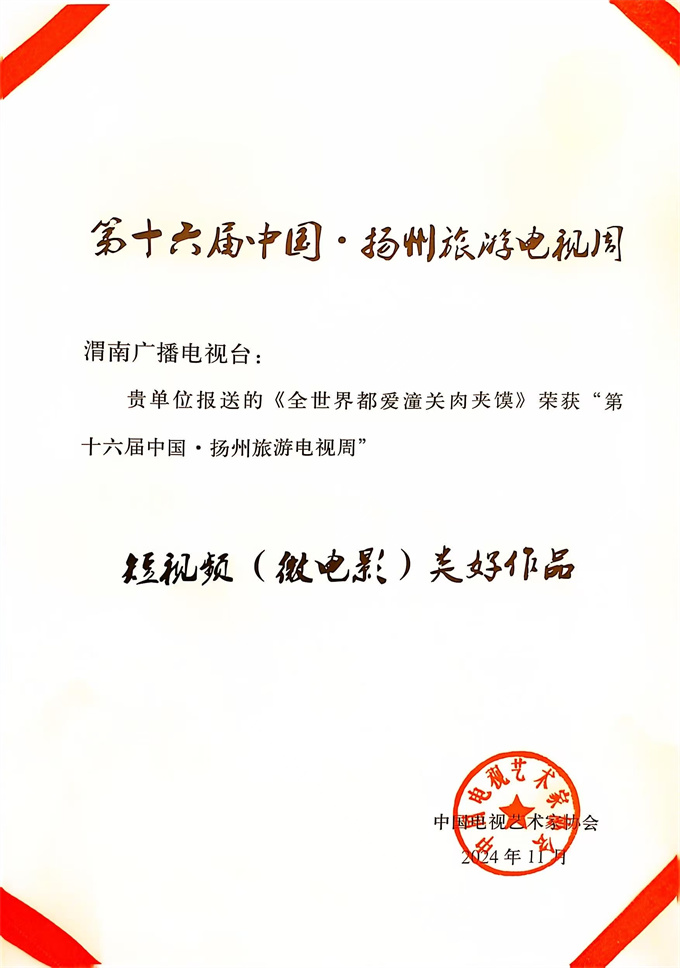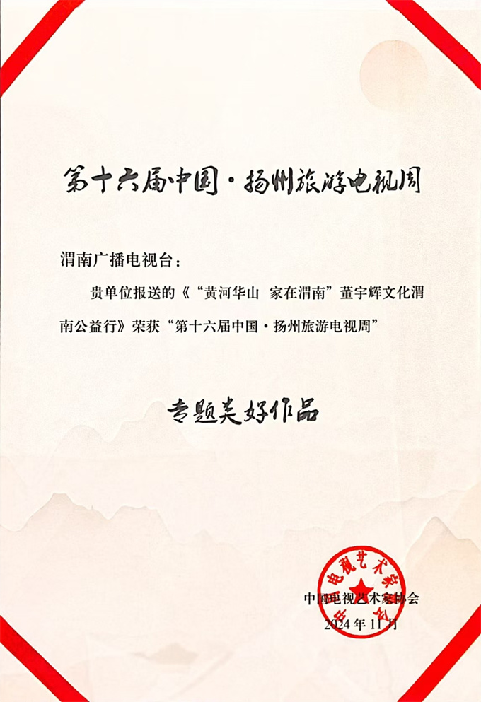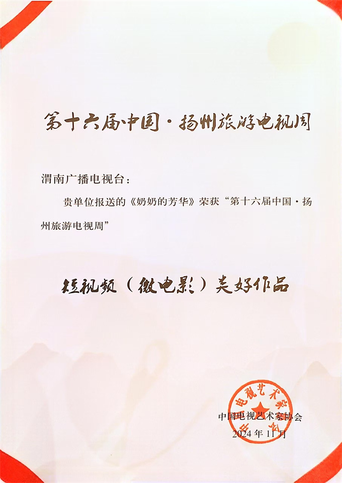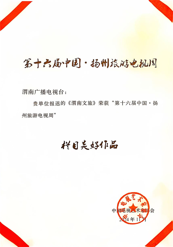 11月12日,由中国电视艺术家协会主办的“第十六届中国·扬州旅游电视周”优秀作品颁奖活动揭晓,渭南市电视艺术家协会选送的四件作品获奖。