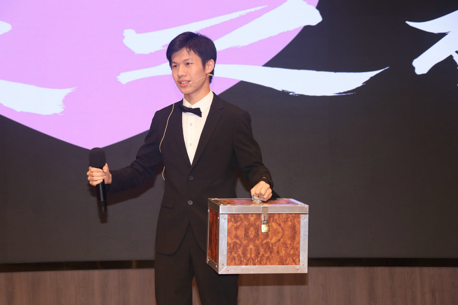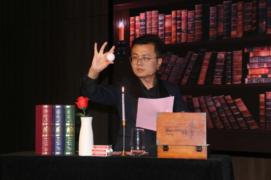 随着暖场环节结束,大家期待已久的魔术表演正式拉开帷幕。“大家看好了,现在有三个球、两个碗,我想让球到哪个碗,它就会乖乖到哪个碗!”“华山戏法”第五代传承人雷霖一登场,就用经典戏法《三仙归洞》抓住了所有人的目光。只见他手法迅捷、翻转自如,小球在碗间神秘穿梭,引得台下惊呼连连:“哇,太神奇了!”