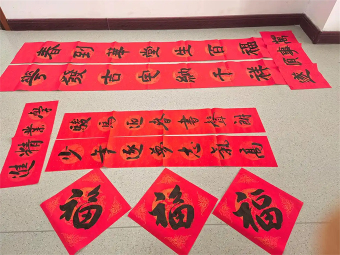 活动现场,长桌铺展,红纸列阵,笔墨齐备。协会的艺术家们热情高涨,各展其能。颜东朝副主席笔走龙蛇,行草书法矫若游龙,一幅幅寓意吉祥的春联在他笔下流淌而出;祖荣斌老师的楷书、傅胜利秘书长的隶书端庄厚重;张亚红老师和王书琦老师的行草潇洒自如,饱满的“福”字承载着深深的祝愿。