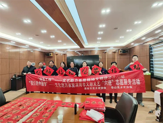 会后,王兴儒主席率部分参会艺术家前往驻景区民营企业——锦前程药业有限公司,开展“迎新春 送祝福”义写春联公益活动。艺术家们挥毫泼墨,将诚挚的祝福倾注于笔端,为坚守岗位的一线职工书写、赠送“福”字与春联近200幅,营造了欢乐祥和的节日氛围,展现了艺术服务社会的担当。