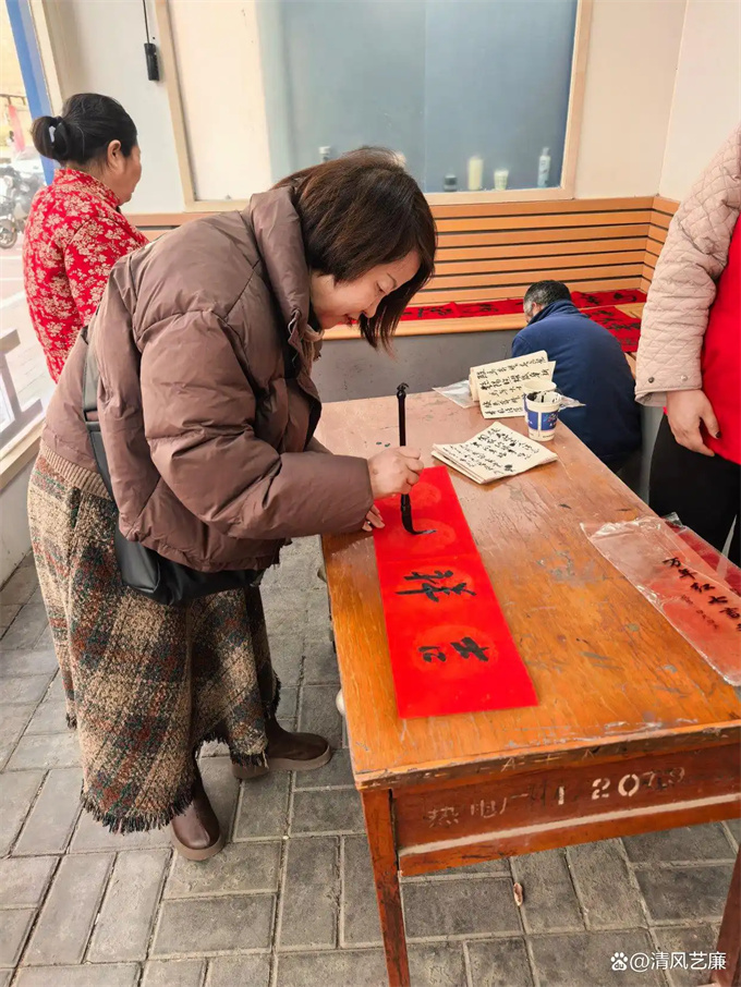 活动现场,书画家们不仅书写传统春联,还根据环卫工人和零工人员的实际需求,即兴创作“定制”作品。一位环卫工人请魏娟文书写“扫尽尘埃春满路,迎来祥瑞福临门”,魏娟文欣然应允,并笑言:“你们是城市的美容师,这幅联正应景。”张亚红和董玲玲的身边也围满了人,大家一边欣赏书法,一边挑选心仪的内容,现场气氛热烈而温馨。