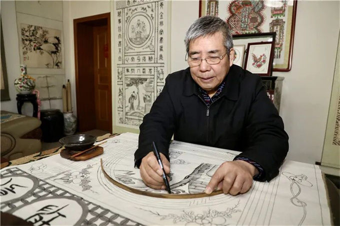 澄城手绘门帘,2009年被列入陕西省第二批非物质文化遗产名录。这门技艺在李天社家族中已传承百余年。其堂曾祖父李成启、堂祖父李仁华、父亲李五常,都曾是澄城沟南地区及大荔、合阳一带知名的民间艺人。1984年,李天社开始跟随父亲学艺,经过3年苦练,掌握了浆布、勾勒、渲染等手绘门帘全套技艺。