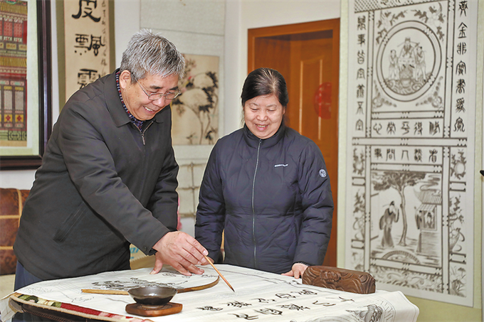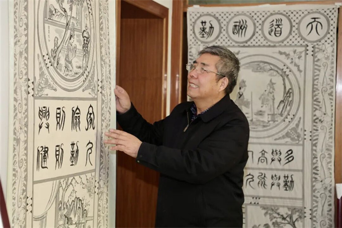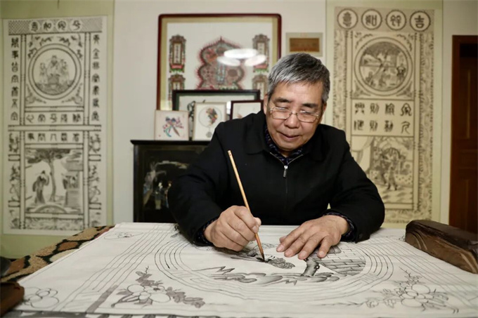李天社家的墙上挂满了手绘门帘,黑白的水墨或淡雅素净,或喜庆热烈,大大小小的门帘错落悬挂,将寻常人家装点得如同一间民间美术展室。