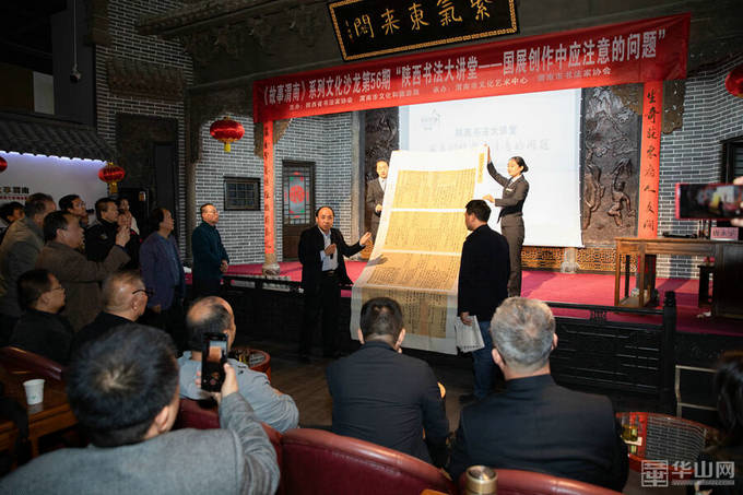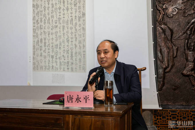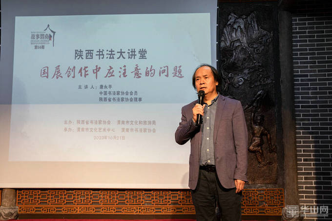 按照陕西省书法家协会安排,中国书法家协会会员、陕西省书法家协会理事唐永平以《国展创作当中应注意的问题》为题,从国展发展现状、十三届国展的变化等三个方面对在书法作品创作中的取法、笔法、结字、章法形式、内容、个性与情感的表达等问题进行了逐一详细解读,并对现场作品进行了详细点评。