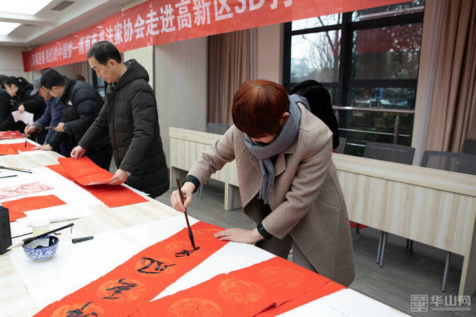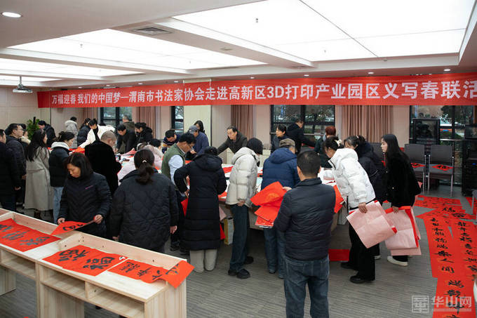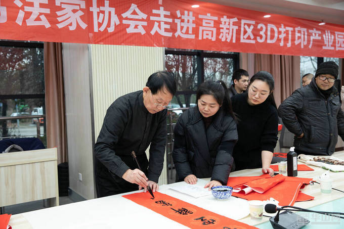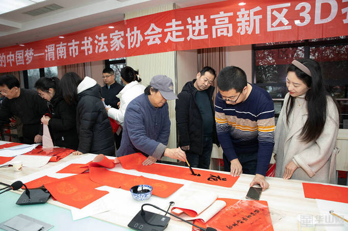 春节将至,年味渐浓。2月1日下午,“万福迎春 我们的中国梦”——渭南市书法家协会走进高新区3D打印产业园区义写春联活动举行,市书协薛小虎、陈龙、贾占强、王拥军、万文胜、王朝华、种洁康、严刚正、侯福元等9名书法家在活动现场为企业干部职工书写春联,送去新春的祝福。