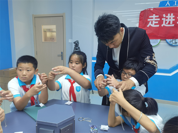在互动环节,贾博涛耐心地向师生们传授了基础戏法《明日环》的手法技巧。他从圆环的持握方式到表演原理,逐一细致指导。孩子们兴致勃勃,认真学习,纷纷举起手中的圆环尝试,在一次次练习中感受戏法的乐趣,现场洋溢着欢声笑语。